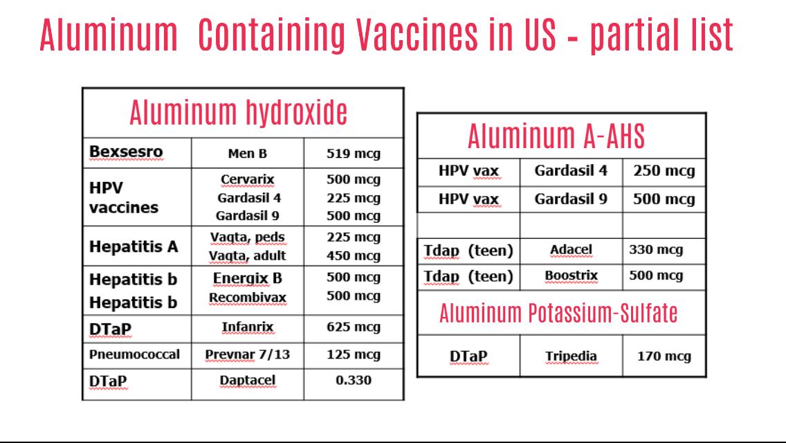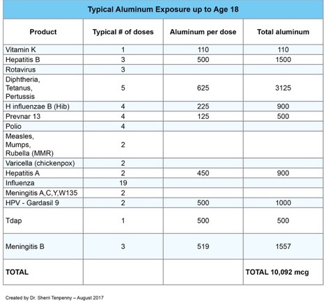 • Heavy exposure to aluminum toxins through childhood vaccinations is the most profound ways that aluminum toxins enter the bloodstream, brain and other essential organs where it is  not easily removed.