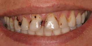 decay of milk teeth; teeth become yellow, dark, and then decay.